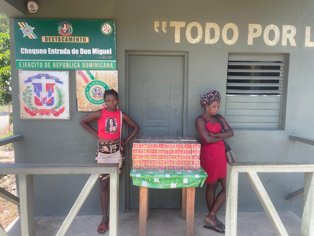 Dajabón RD, –Dos nacionales haitianas en condición migratoria irregular, fueron detenidas por soldados del Ejército de República Dominicana, cuando se desplazaban con 16,000 cigarrillos ilícitos en la comunidad Don Miguel de la provincia Dajabón.