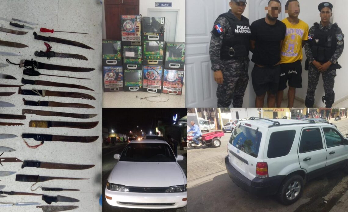 SANTO DOMINGO NORTE RD.-Agentes policiales adscritos a la Dirección Regional Santo Domingo Norte recuperaron dos vehículos robados, incautaron diez máquinas tragamonedas y confiscaron 40 armas punzantes durante operativos realizados en distintos sectores de Sabana Perdida, como parte de las acciones preventivas desarrolladas para fortalecer la seguridad ciudadana.