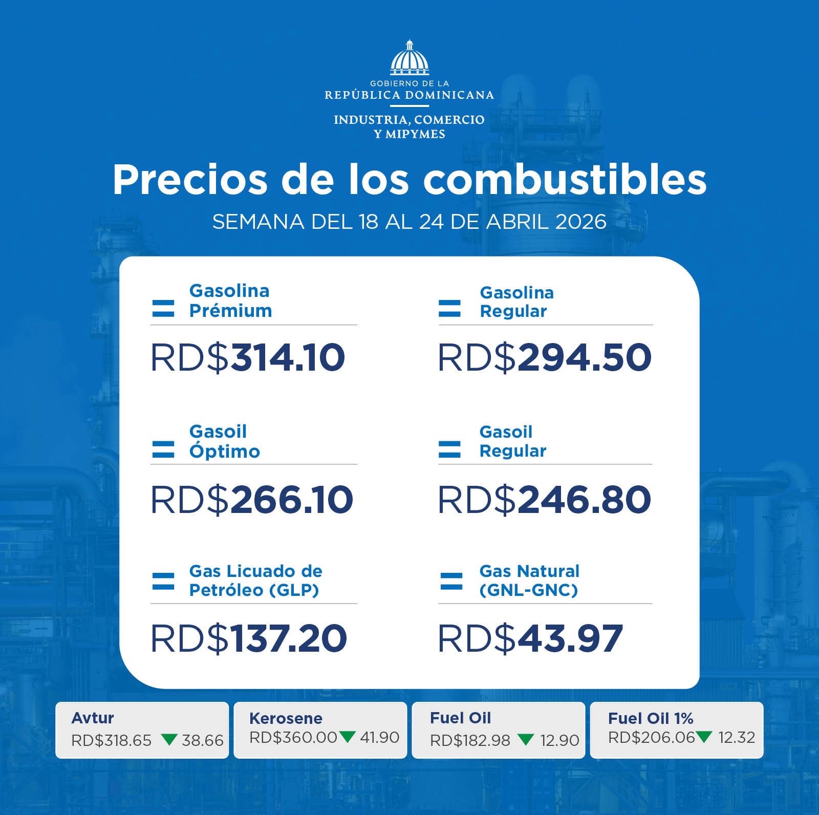 Para la semana del 18 al 24 de abril 2026, el Ministerio de Industria, Comercio y Mipymes dispone que los combustibles se comercialicen a los siguientes precios: