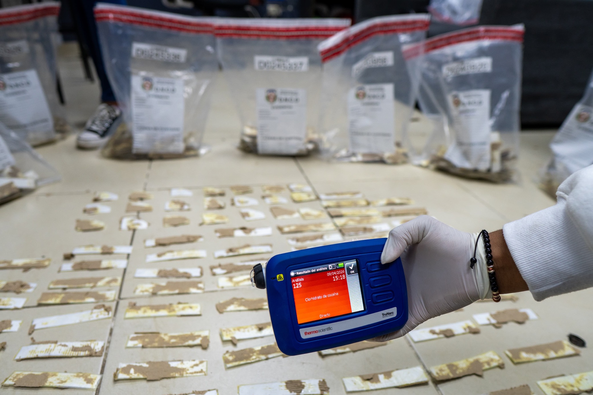Por instrucciones del fiscal, se procedió a requisar las cajas, 62 en total, descubriendo en 58 de ellas, un doble fondo, conteniendo un total de 735 láminas pequeñas, de presumible cocaína, empacadas en fundas plásticas transparentes, con un peso superior a los tres (03) kilogramos.