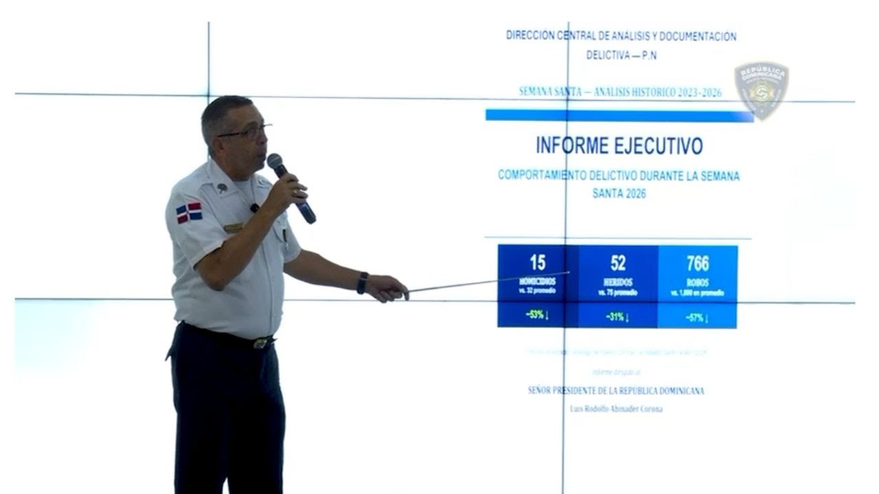 SANTO DOMINGO RD.-La Policía Nacional reportó este lunes una reducción histórica en los principales indicadores delictivos durante la Semana Santa 2026, con descensos de 57% en robos, 53% en homicidios y 31% en personas heridas, en comparación con el promedio de los años 2023 al 2025, durante el período comprendido entre el Domingo de Ramos (29 de marzo) y el Sábado Santo (4 de abril).