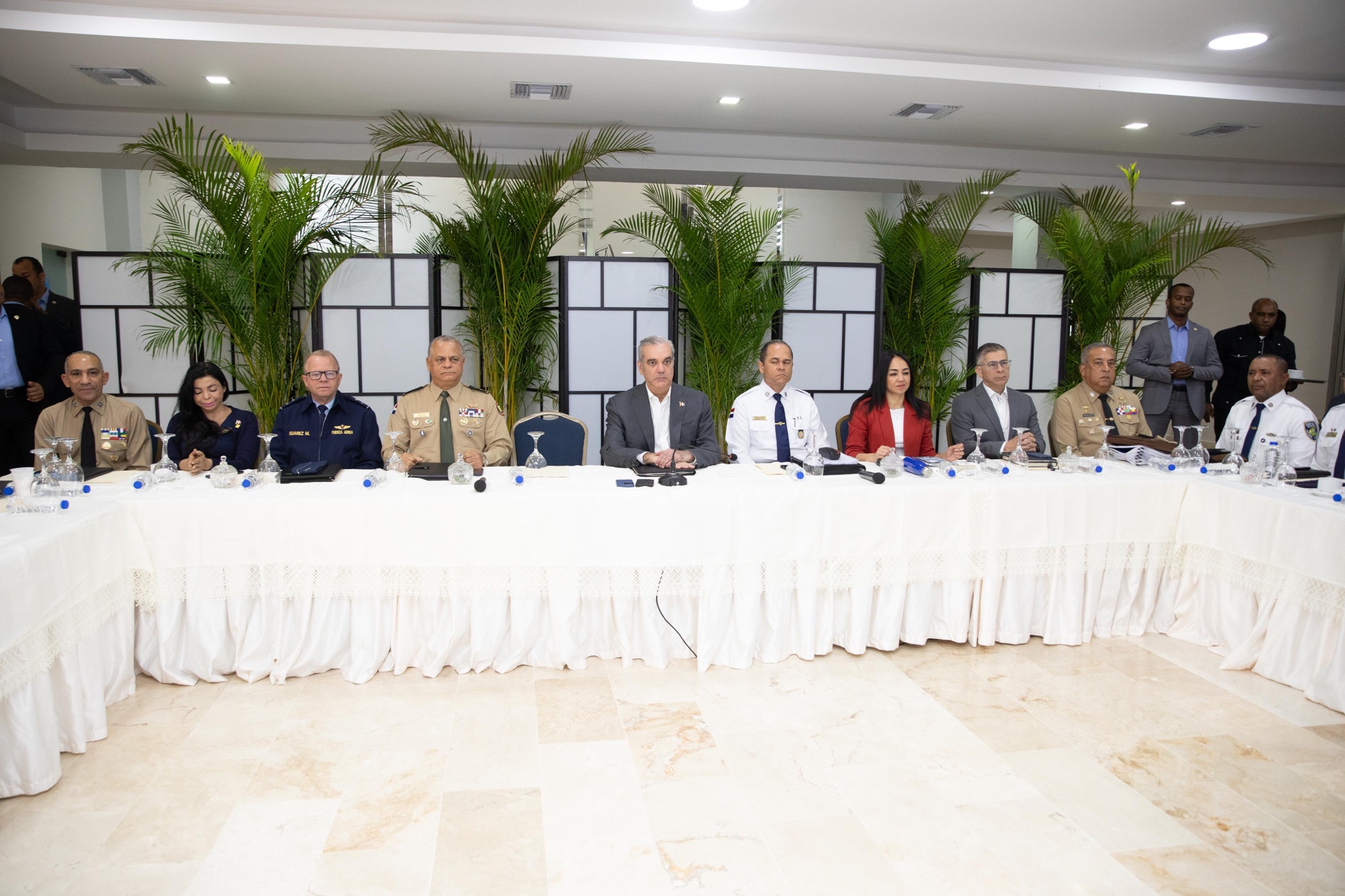 En compañía del mandatario se encuentran, los ministros de la Presidencia, José Ignacio Paliza; de Defensa, teniente general Carlos Antonio Fernández Onofre; de Interior y Policía, Faride Raful; el comandante general de la Fuerza Aérea de República Dominicana, mayor general Piloto Floreal Tarcicio Suárez Martínez; los directores de la Policía Nacional, mayor general, Andrés Modesto Cruz Cruz; de Migración, vicealmirante Luis Rafael Lee Ballester;
